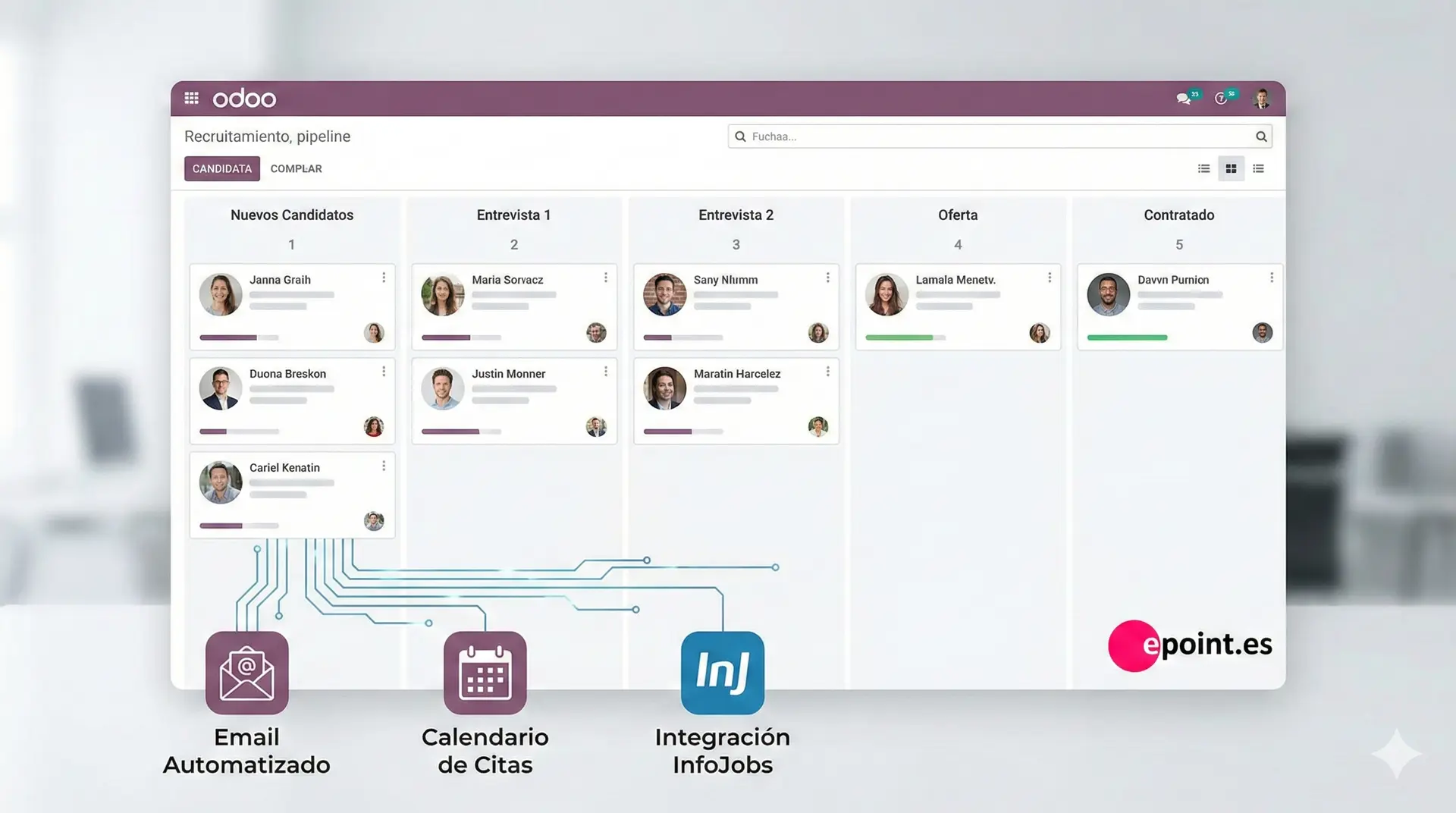La propia documentación de Odoo explica este enfoque por “tarjetas” que avanzan por etapas en un flujo de reclutamiento, y cómo esas etapas pueden disparar acciones automáticas. (Odoo)