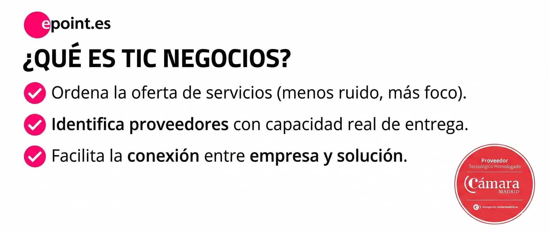 Por eso hoy queremos compartir una noticia relevante para epoint.es: ya somos proveedor tecnológico homologado en el Portal TIC Negocios de la Cámara de Comercio de Madrid, y nuestra ficha de servicios está publicada y accesible para empresas que buscan apoyo en transformación digital.