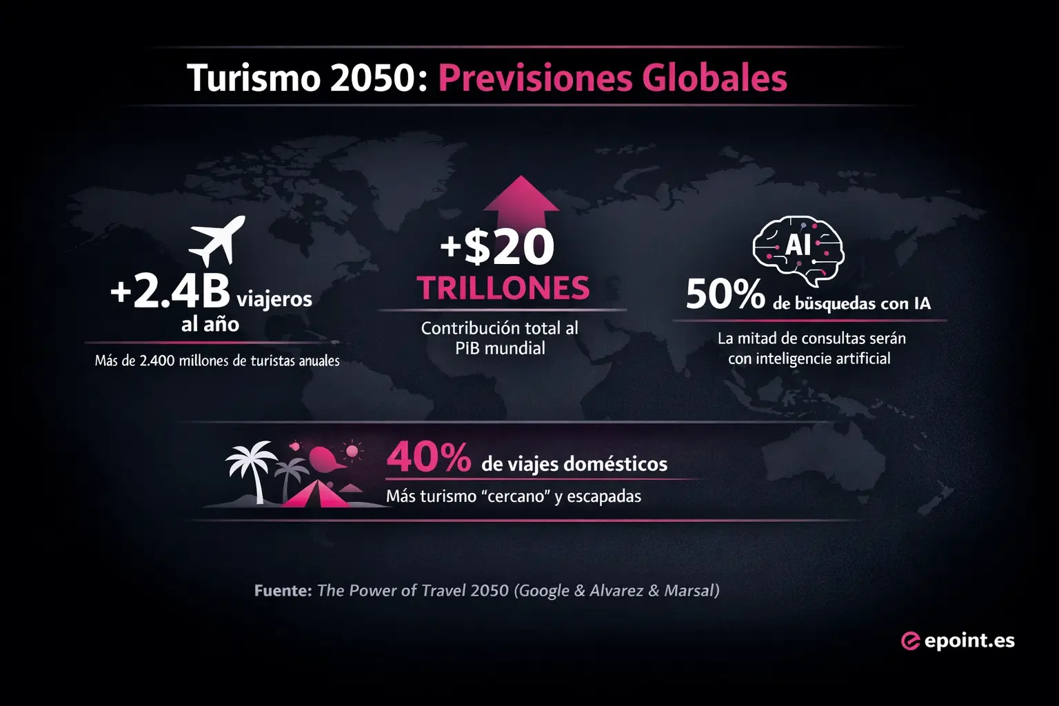 El estudio The Power of Travel 2050 —colaboración entre Google y Alvarez & Marsal— se propone algo muy concreto: anticipar flujos y tendencias globales con modelos predictivos basados en múltiples variables y señales (incluyendo búsquedas), y traducirlo en implicaciones accionables para la industria.
