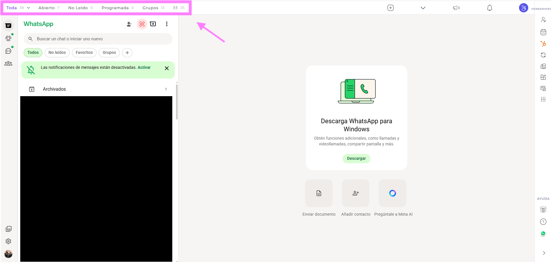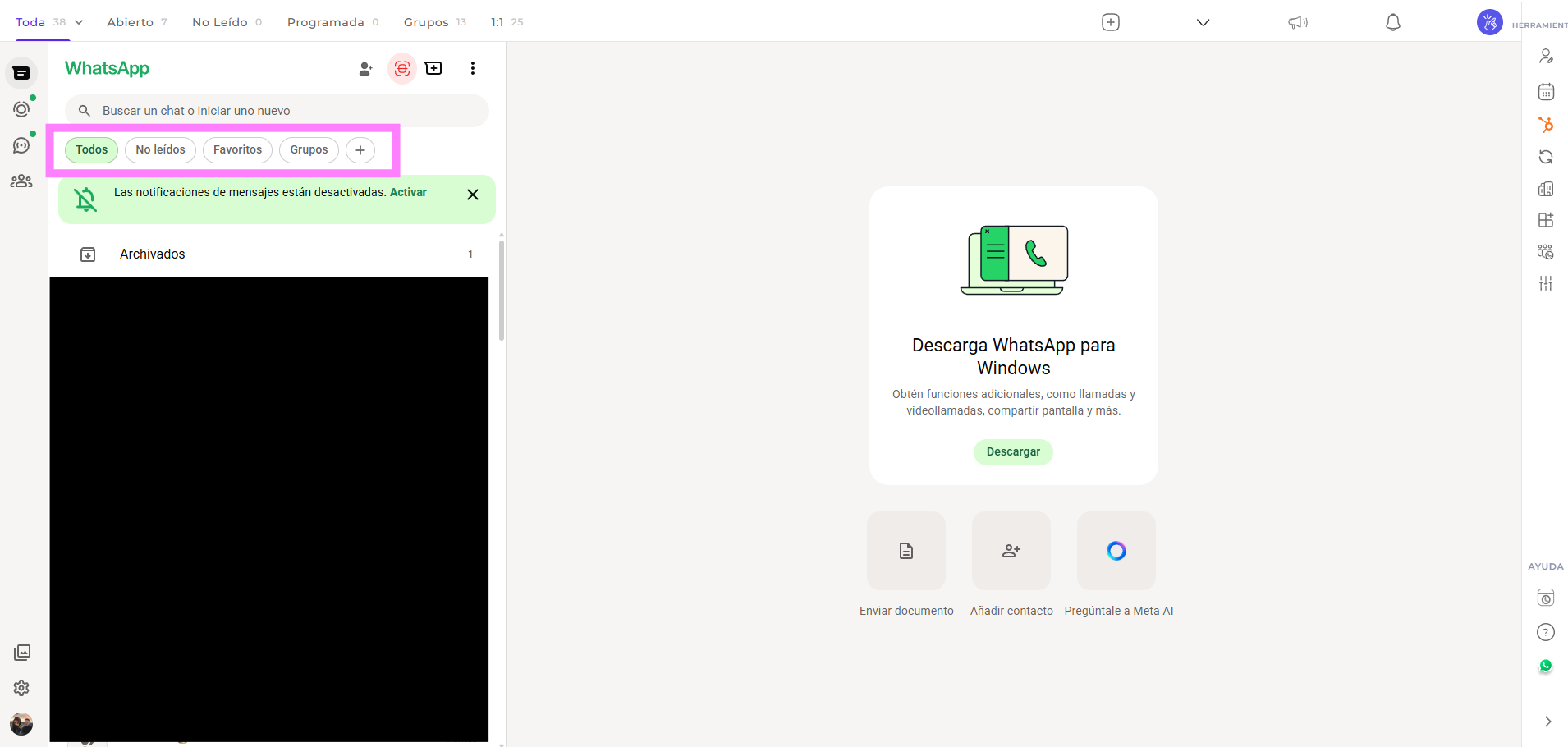 En la parte superior de la lista de chats aparece una barra con filtros rápidos que permiten clasificar las conversaciones: