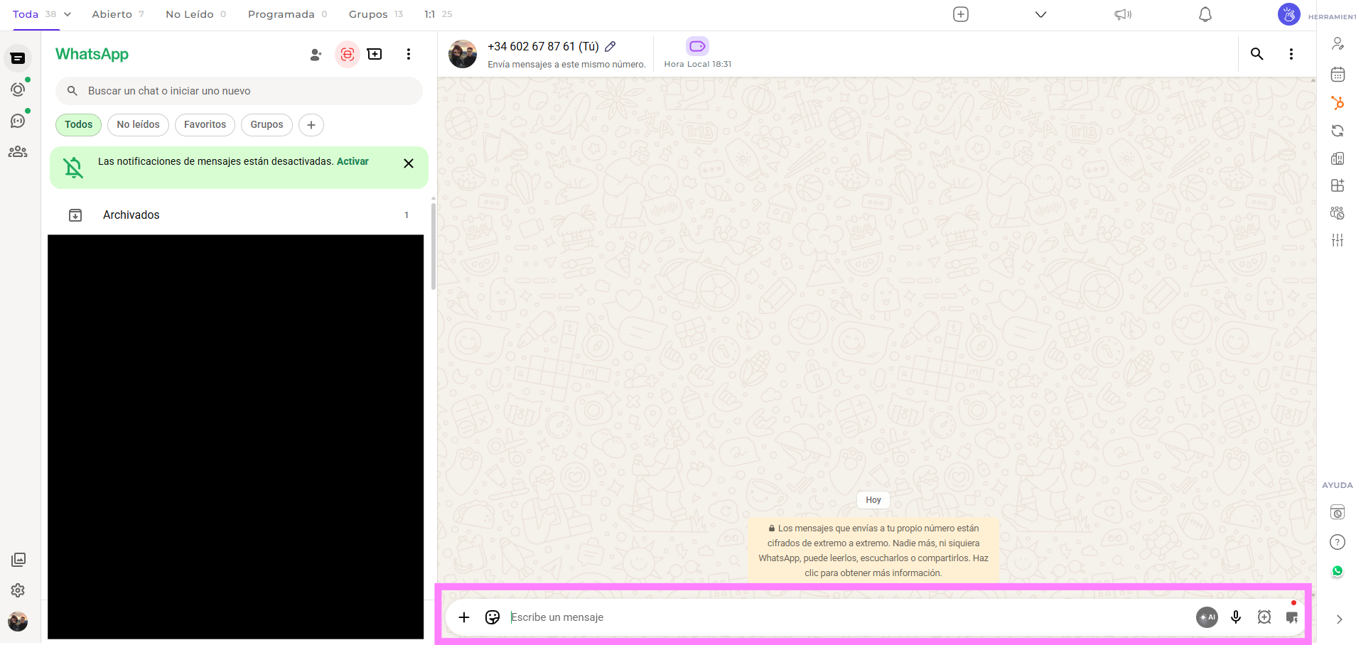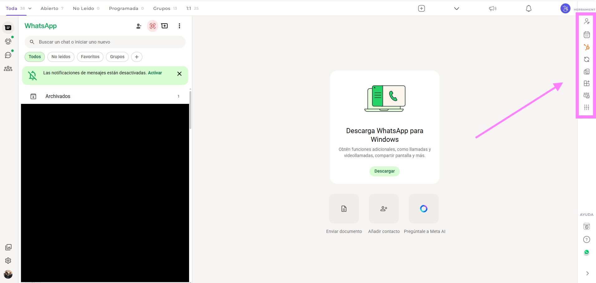 Al acceder a WhatsApp Web con el plugin instalado, la interfaz se amplÃa con funcionalidades adicionales que se integran directamente en la pantalla de WhatsApp. La apariencia general se mantiene familiar, pero se añaden nuevos elementos en la parte superior, en la barra lateral derecha y dentro de cada conversación.