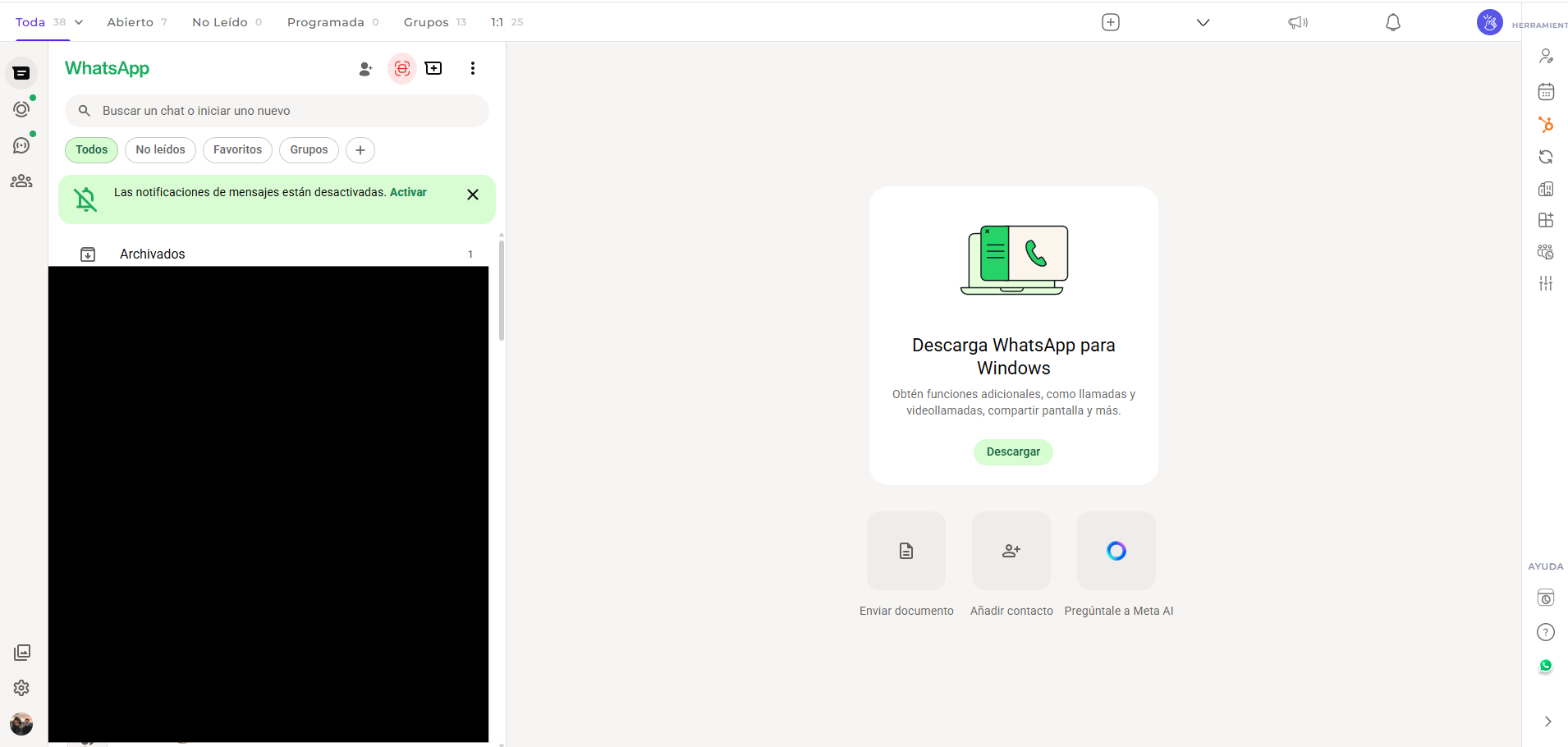 · Integraciones: acceso rápido a las integraciones configuradas (HubSpot, etc.).