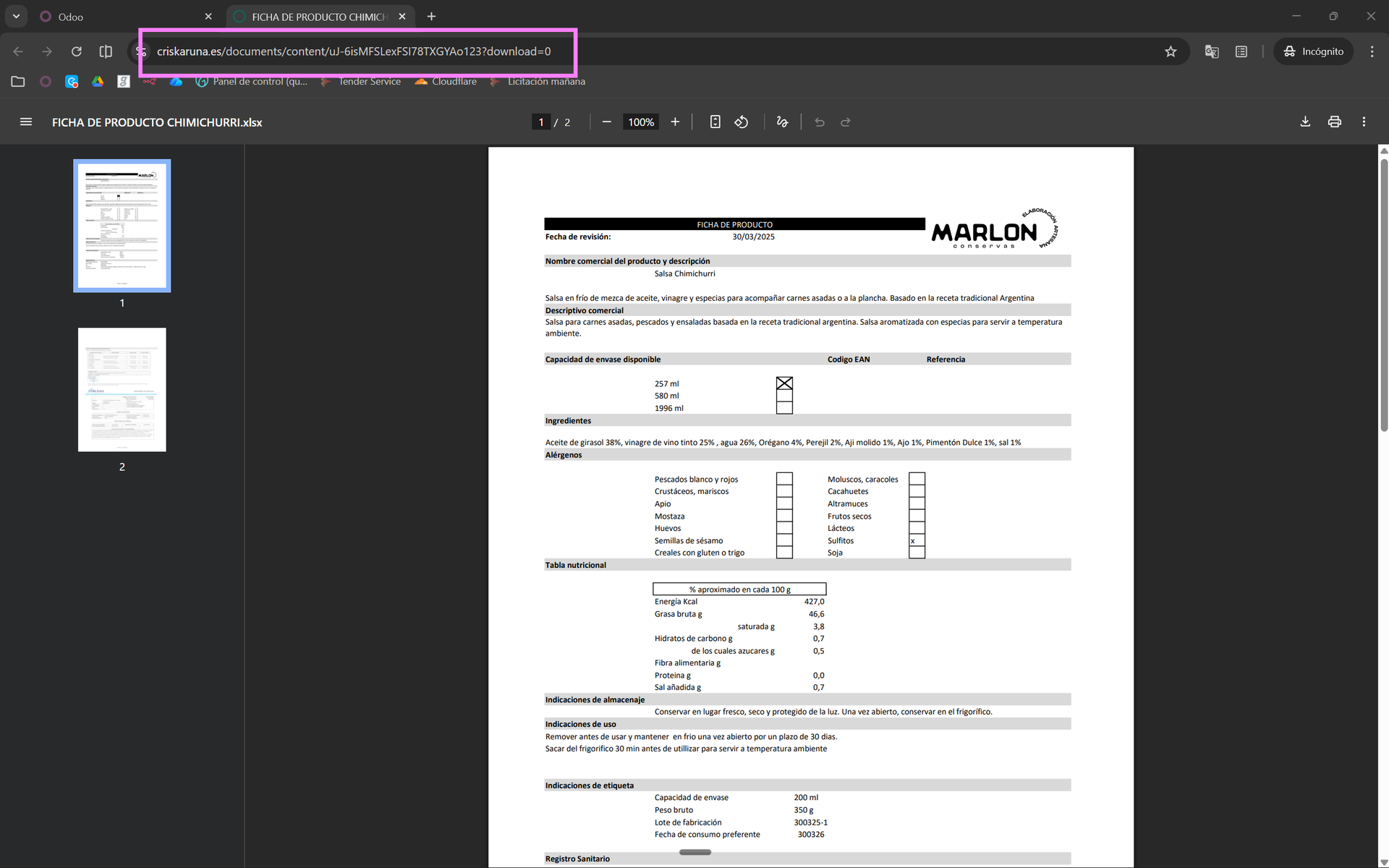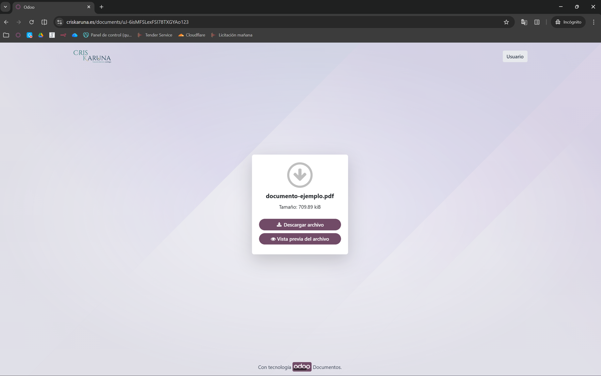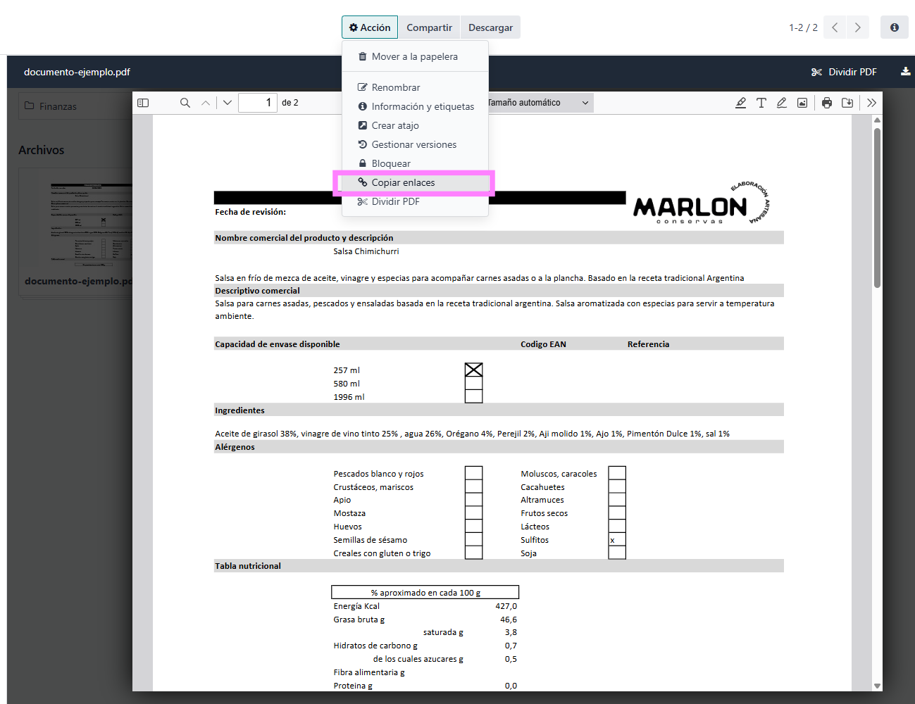Tras acceder al enlace, podemos ver que está el documento de ejemplo y podemos descargarlo o previsualizarlo. Como en la mayoría de los casos necesitamos que el usuario acceda directamente al pdf, podemos darle a "vista previa del archivo" y copiar ese enlace en vez del anterior: