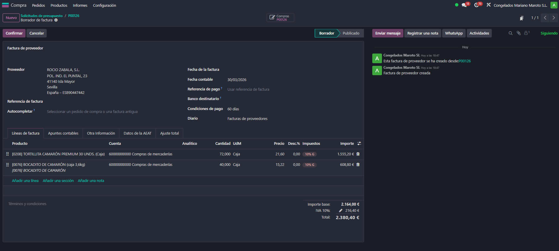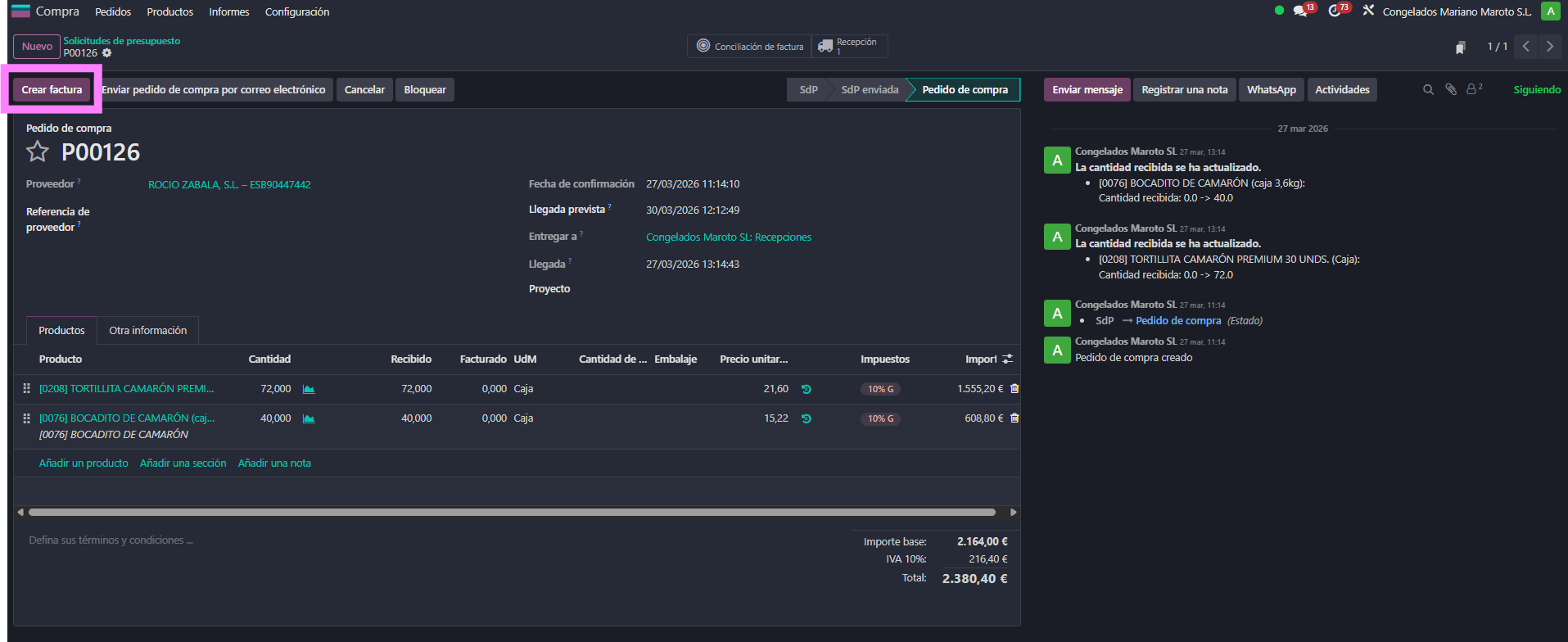 - Abrir un pedido de compra y crear la factura de proveedor desde el pedido.