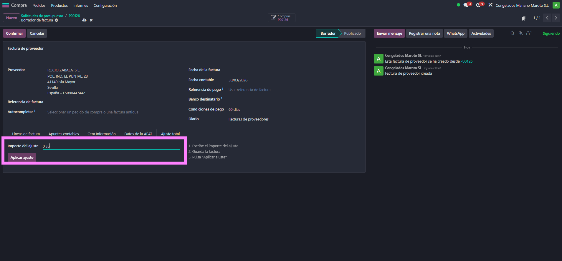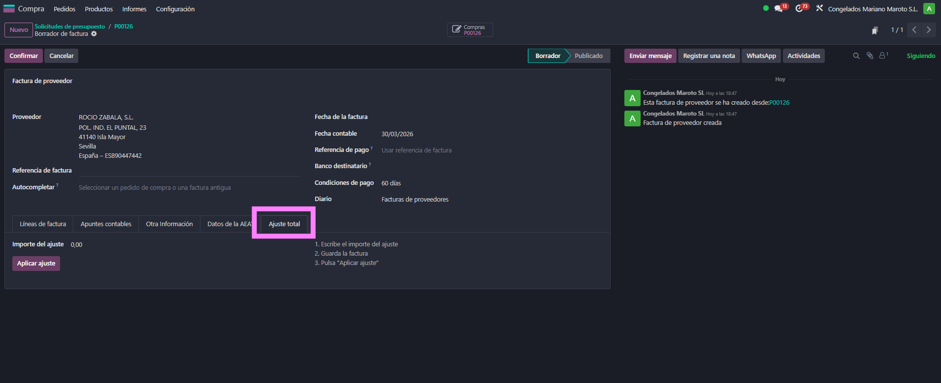 - En la factura de proveedor, ir a la pestaña "Ajuste total".