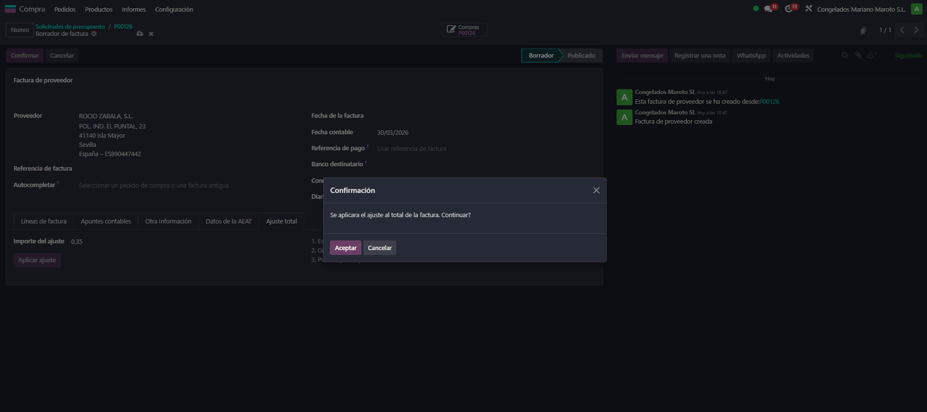 Después de escribir el importe, guardar la factura y pulsar el botón "Aplicar ajuste". Aparecerá un diálogo de confirmación.