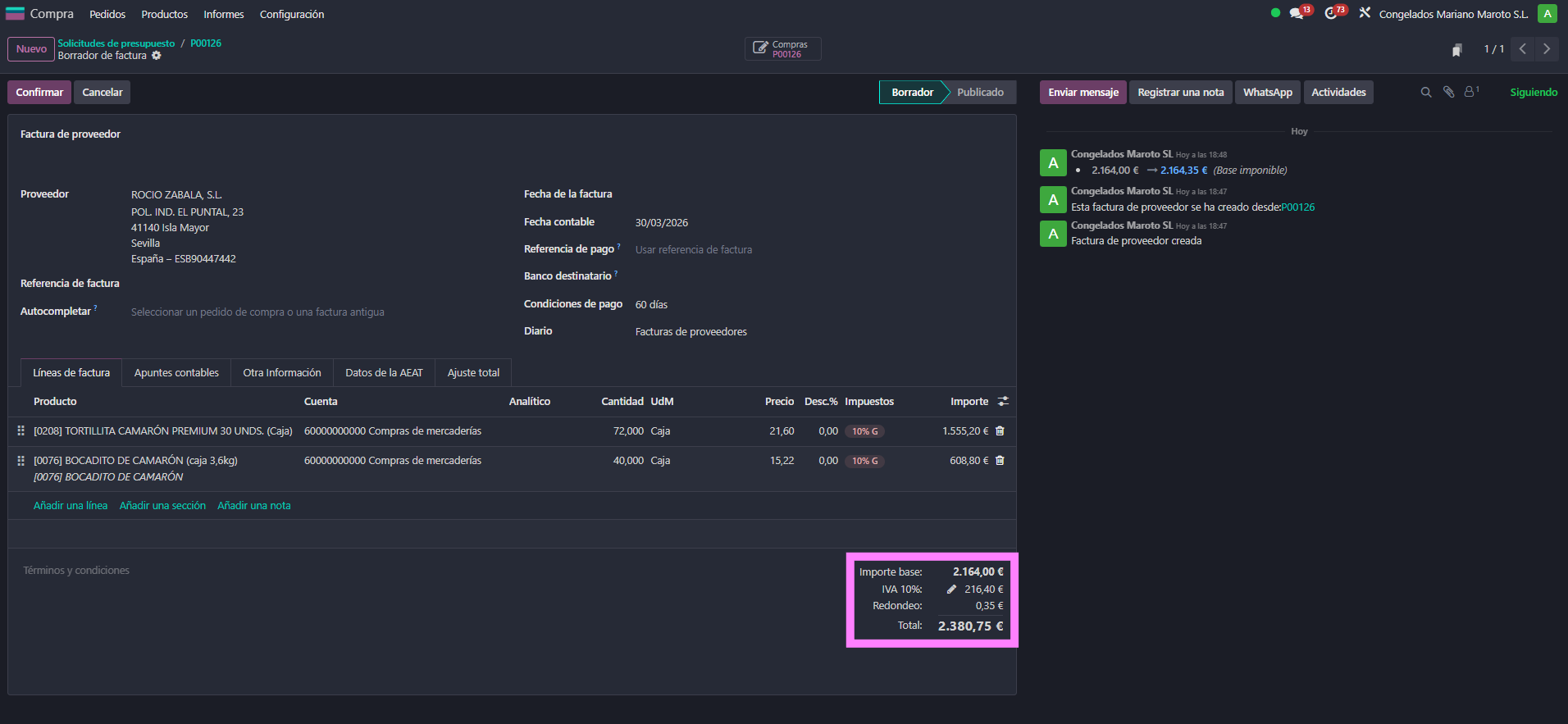 Abrir la factura de proveedor (en borrador) |