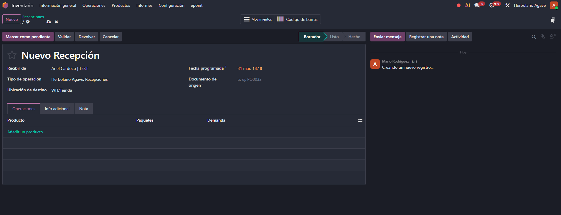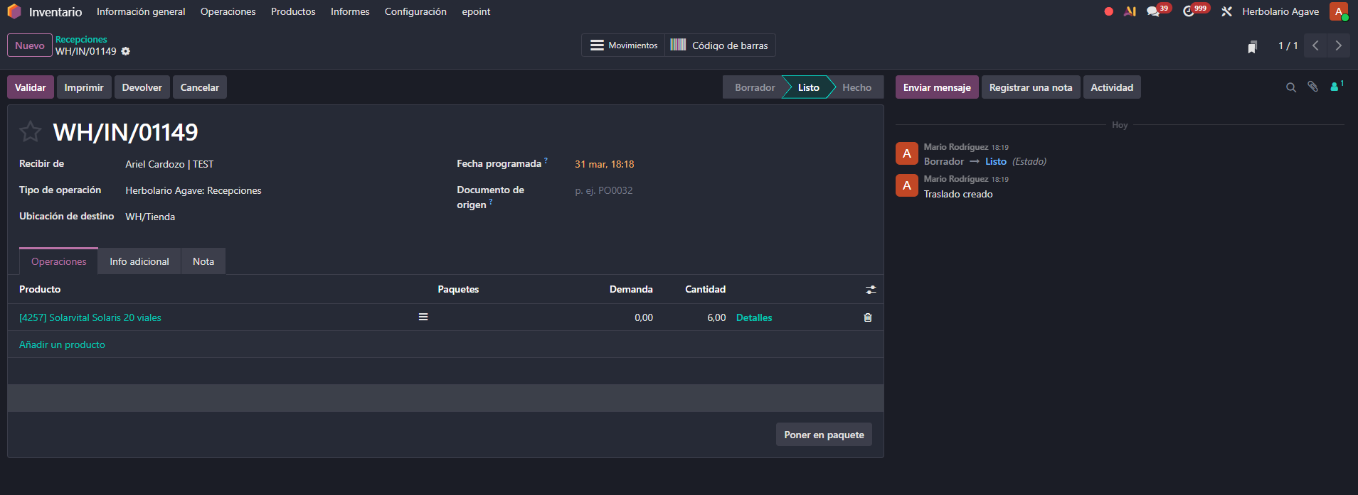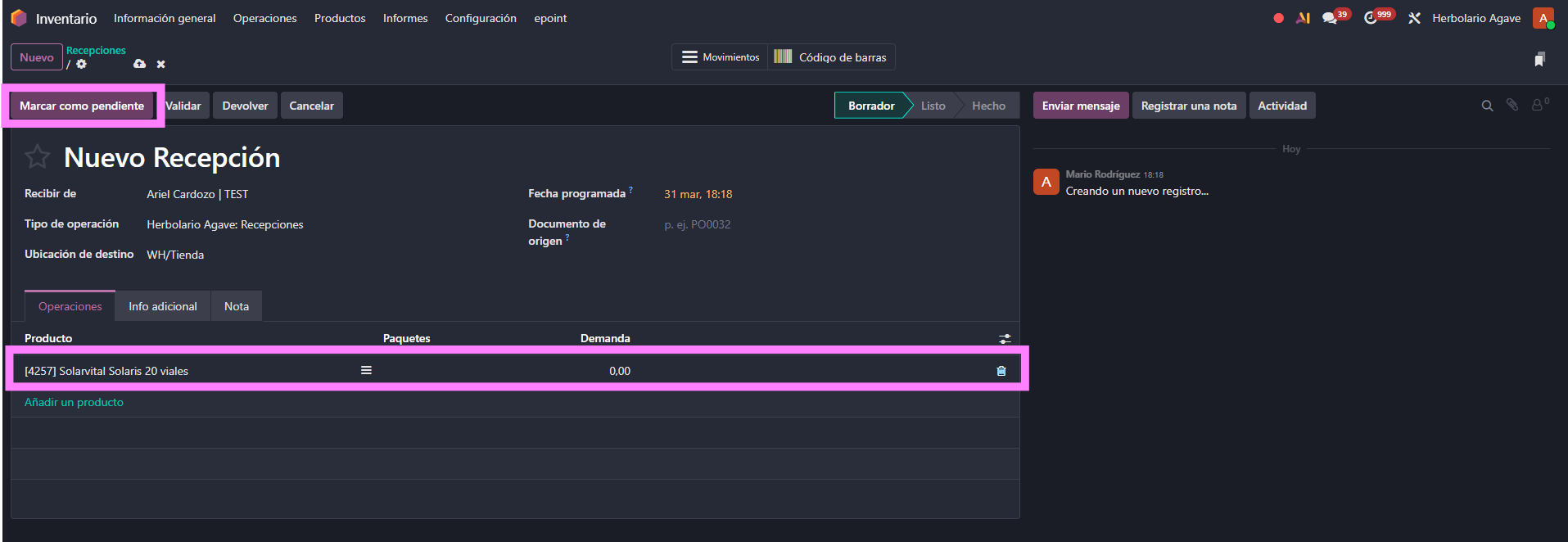 Para procesar una recepción de mercancía, el usuario accede a Inventario > Operaciones > Recepciones y crea un nuevo albarán. A continuación añade los productos que va a recibir. En este ejemplo se utiliza el producto "Solarvital Solaris 20 viales", que tiene activado el seguimiento por lotes.