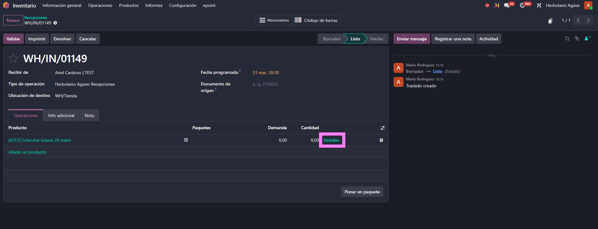 Una vez añadidos los productos, se confirma el albarán pulsando "Marcar como pendiente". Esto pasa el albarán a estado "Listo" y genera las líneas de operación donde se introducen los lotes. Para acceder a estas líneas, el usuario hace clic en el icono ≡ que aparece junto al producto.