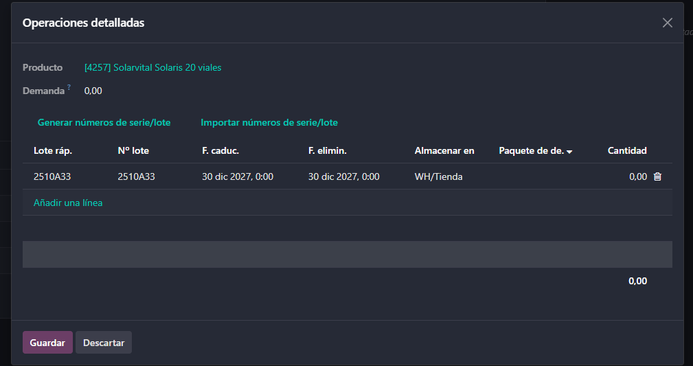 - Las fechas que se rellenan son la de caducidad y la de eliminación. Las fechas de consumo preferente y alerta no se copian porque Odoo no las incluye en las líneas de operación.