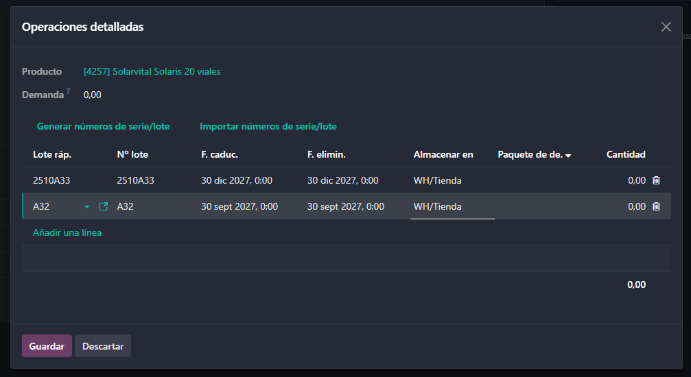 El proceso se puede repetir para cada línea del albarán. Cada línea puede tener un lote diferente con sus propias fechas. En la siguiente captura se muestran dos líneas con los lotes 2510A33 y A32, cada una con sus fechas de caducidad y eliminación completadas de forma independiente y automática.