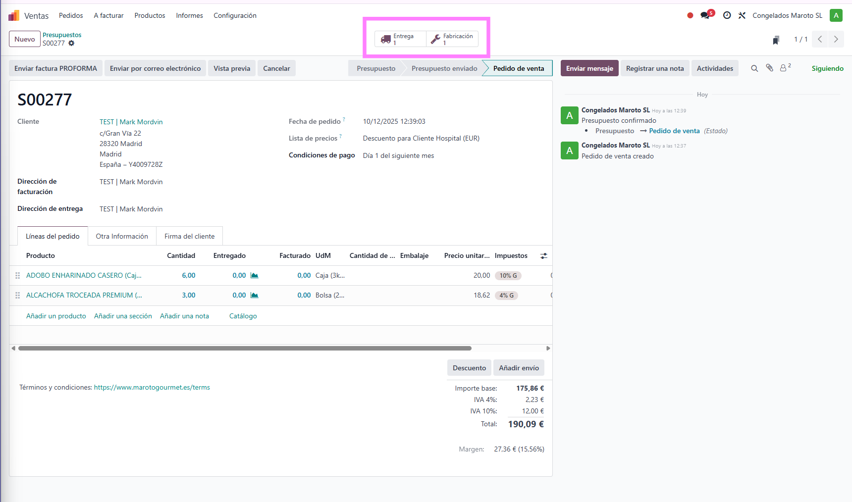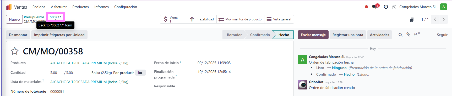 Con el producto fabricado, volvemos al flujo de ventas para finalizar el proceso.