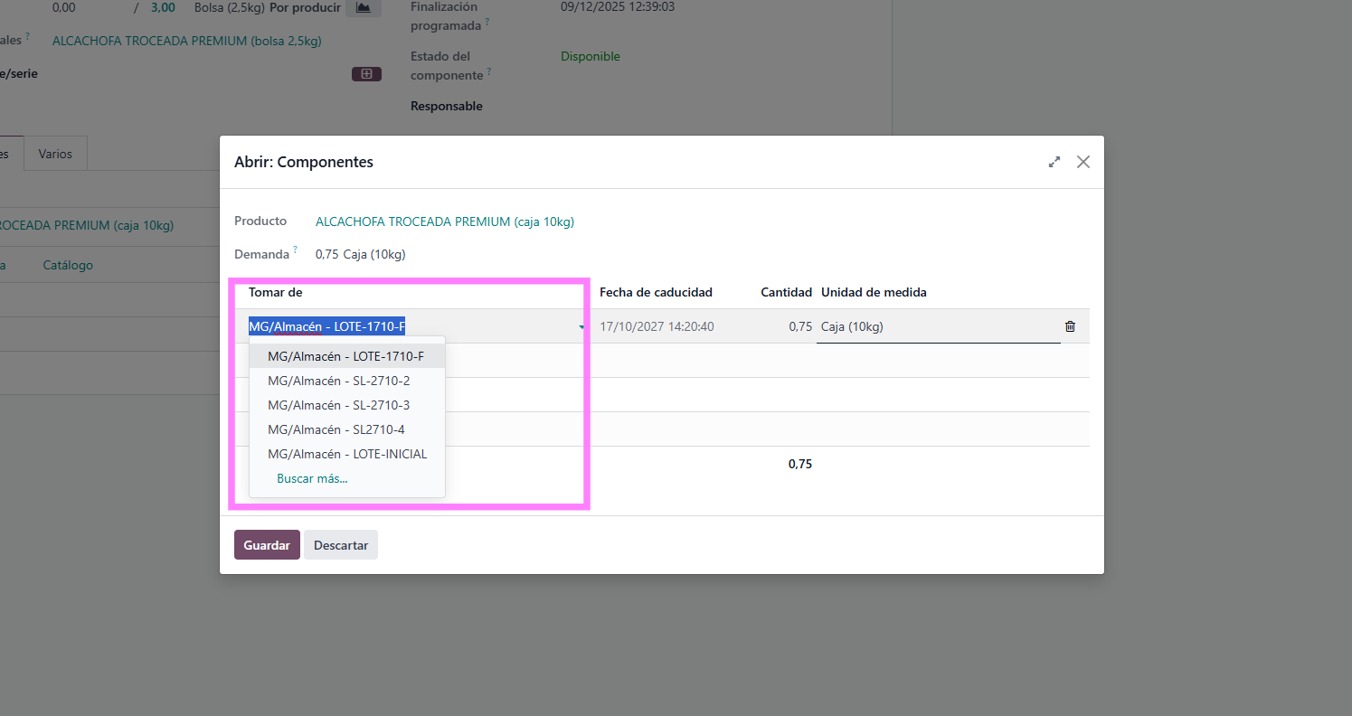 Paso 2.2: Gestión de Lotes y Componentes En la pantalla de fabricación, el sistema habrá reservado automáticamente los componentes necesarios basándose en la lógica FEFO (First Expired, First Out - Primero en caducar, primero en salir) o FIFO.