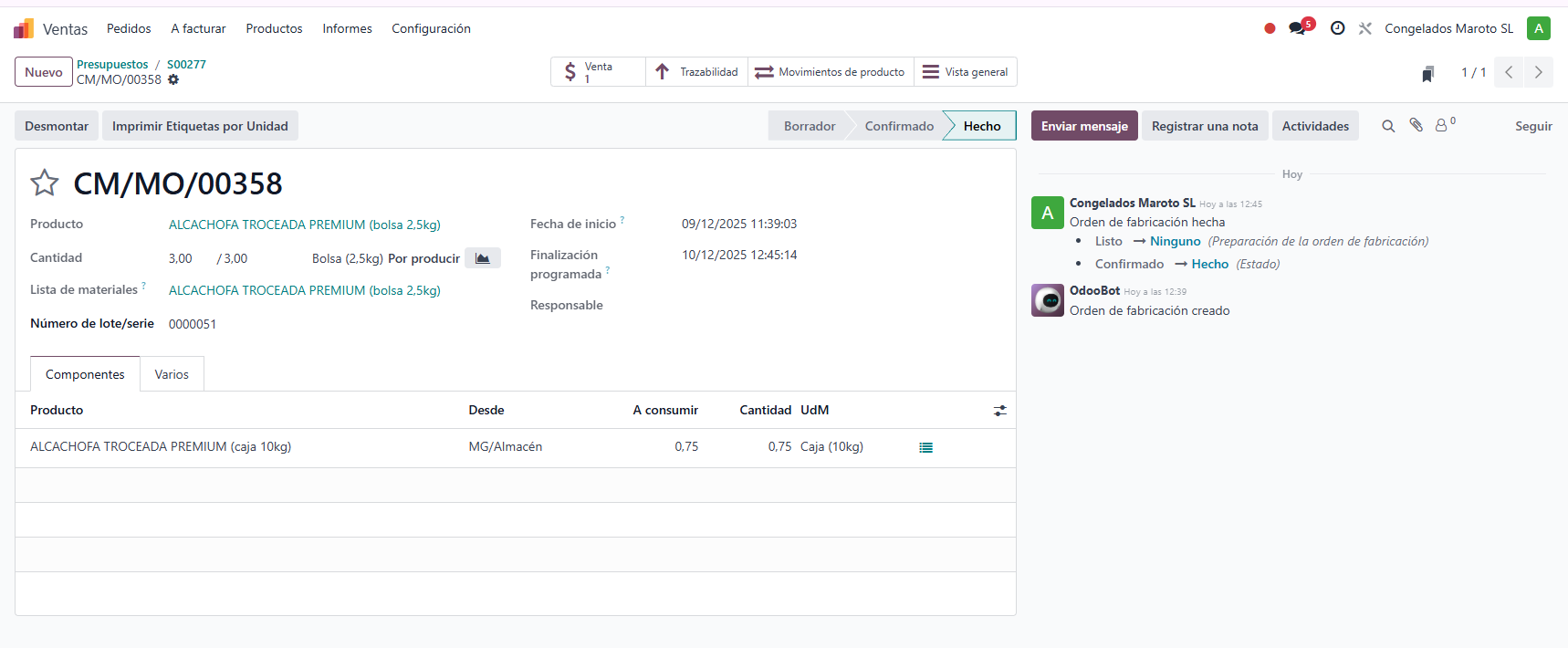 En este momento, el sistema ha dado de baja la materia prima y ha dado de alta las 3 bolsas (producto terminado) en el inventario, asignándoles su propio lote si asà está configurado.