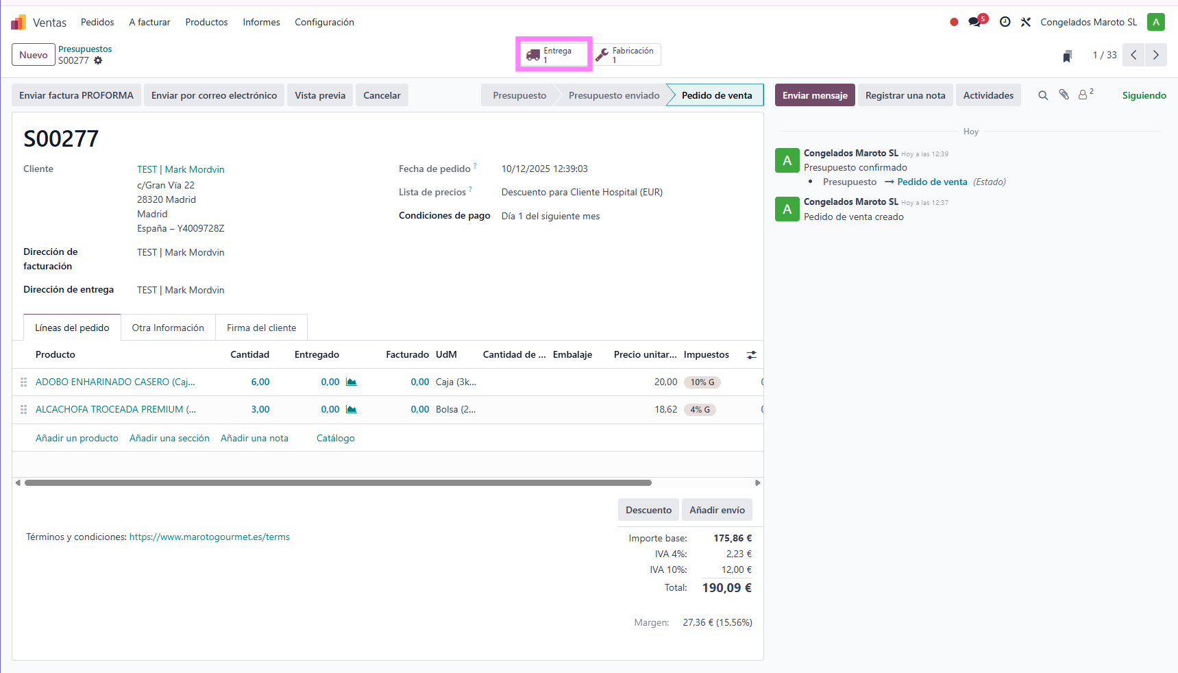 Desde el pedido, hacemos clic en el botón inteligente de Entrega (icono del camión).