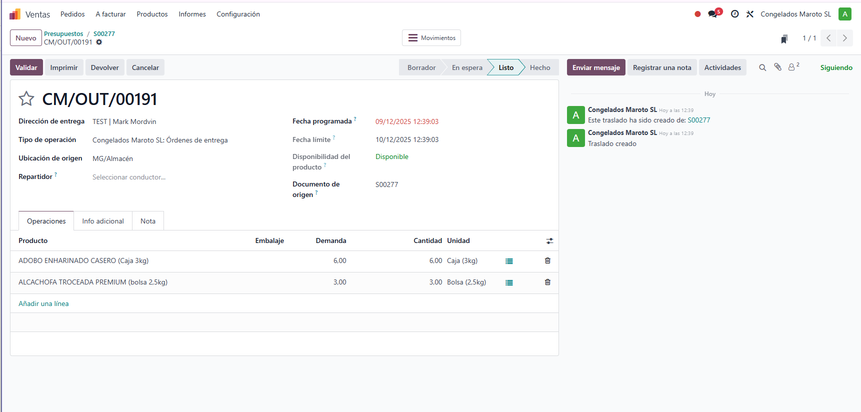 Paso 3.2: Validación del EnvÃo Ahora veremos que el estado de disponibilidad ha cambiado. El sistema ha reservado las bolsas recién fabricadas para este cliente.