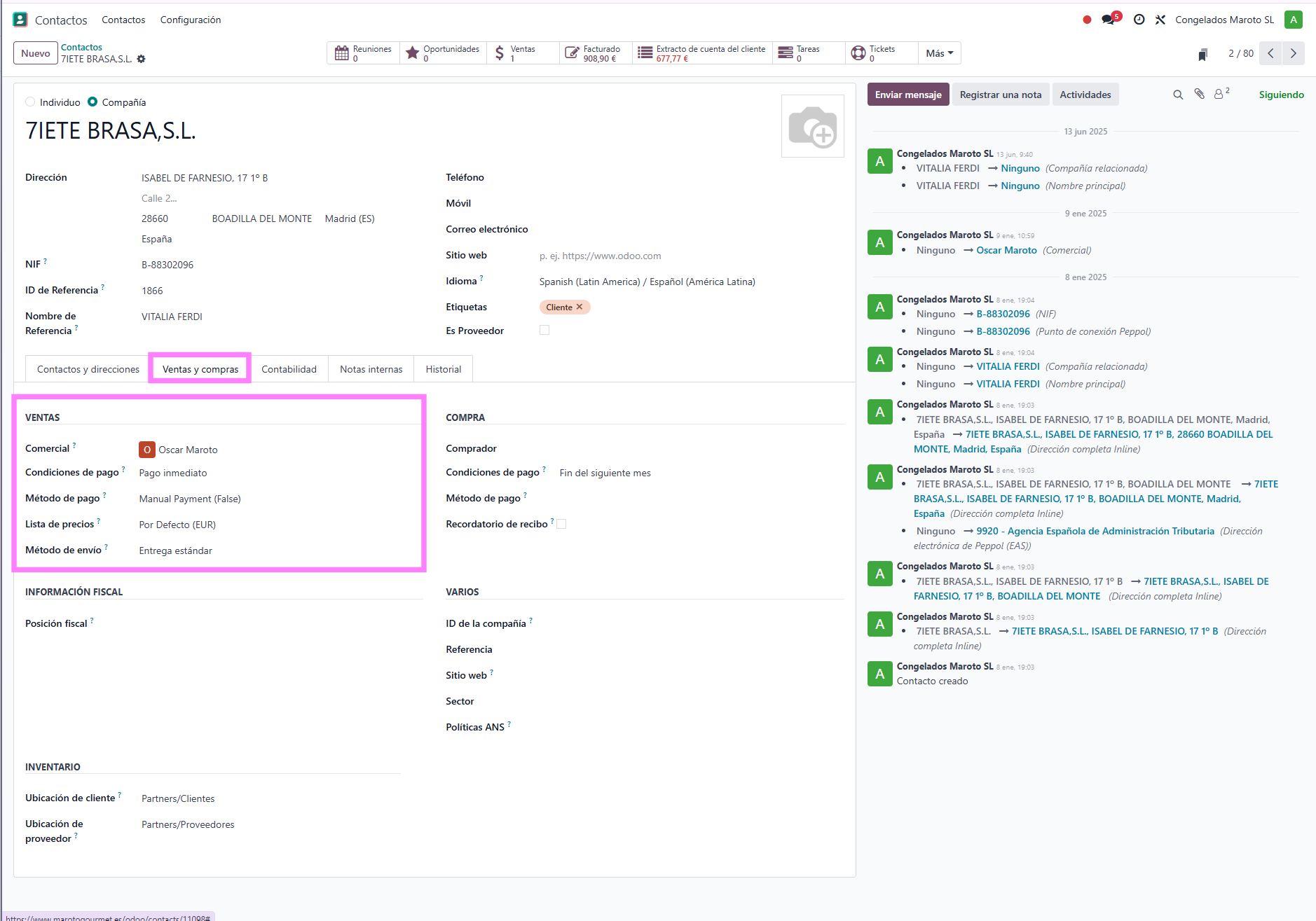 Ruta: Contactos > Seleccionar Cliente > Pestaña Ventas y compras.