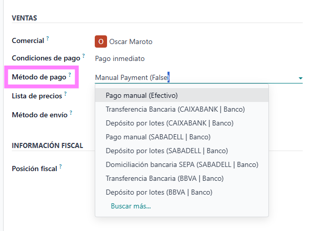 Aquí definimos cómo nos suele pagar este cliente por defecto. Aunque tenga varios métodos, elegiremos el más habitual.