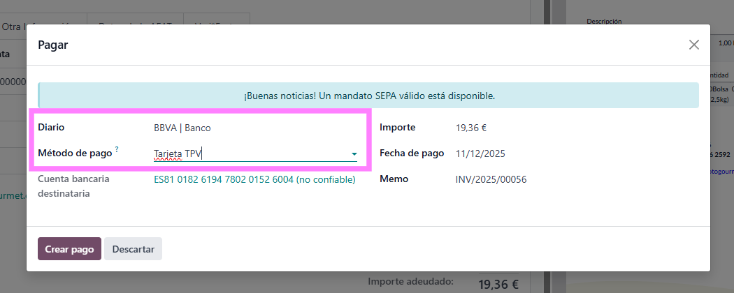 | Datáfono (TPV) | Factura > Registrar Pago > Banco > Tarjeta TPV |