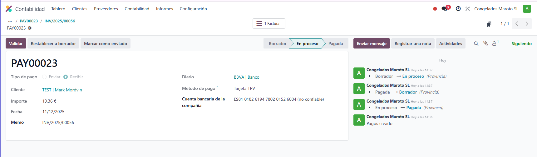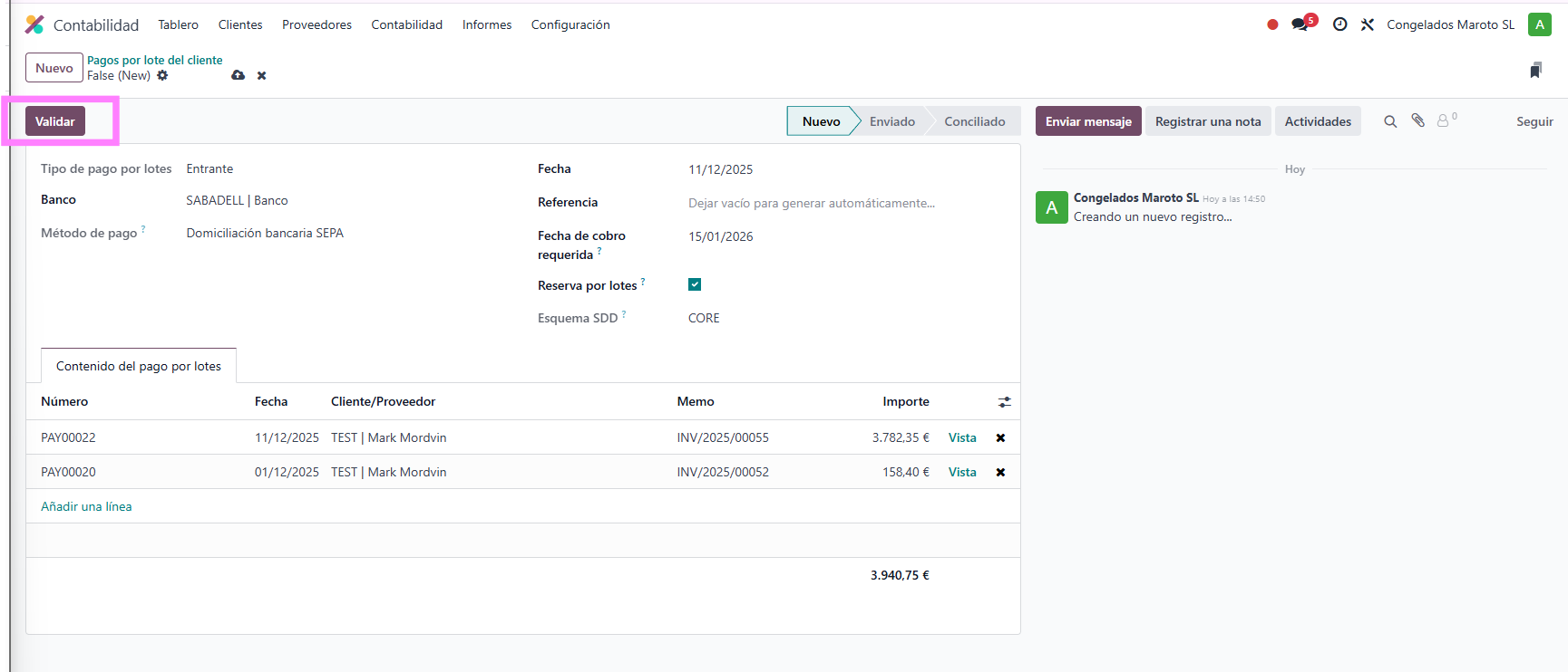 💡 Consejo: Si al validar te da error, revisa que el cliente tenga un Mandato firmado y activo en su ficha y que nuestra empresa tenga configurado el Identificador de Acreedor en los ajustes.