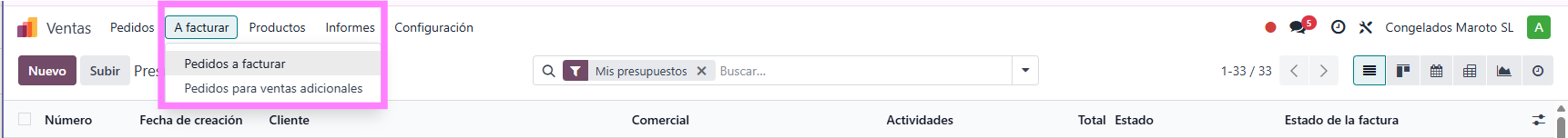 Ruta: Ventas > A facturar > Pedidos a facturar (o Pedidos > Filtro "A facturar").