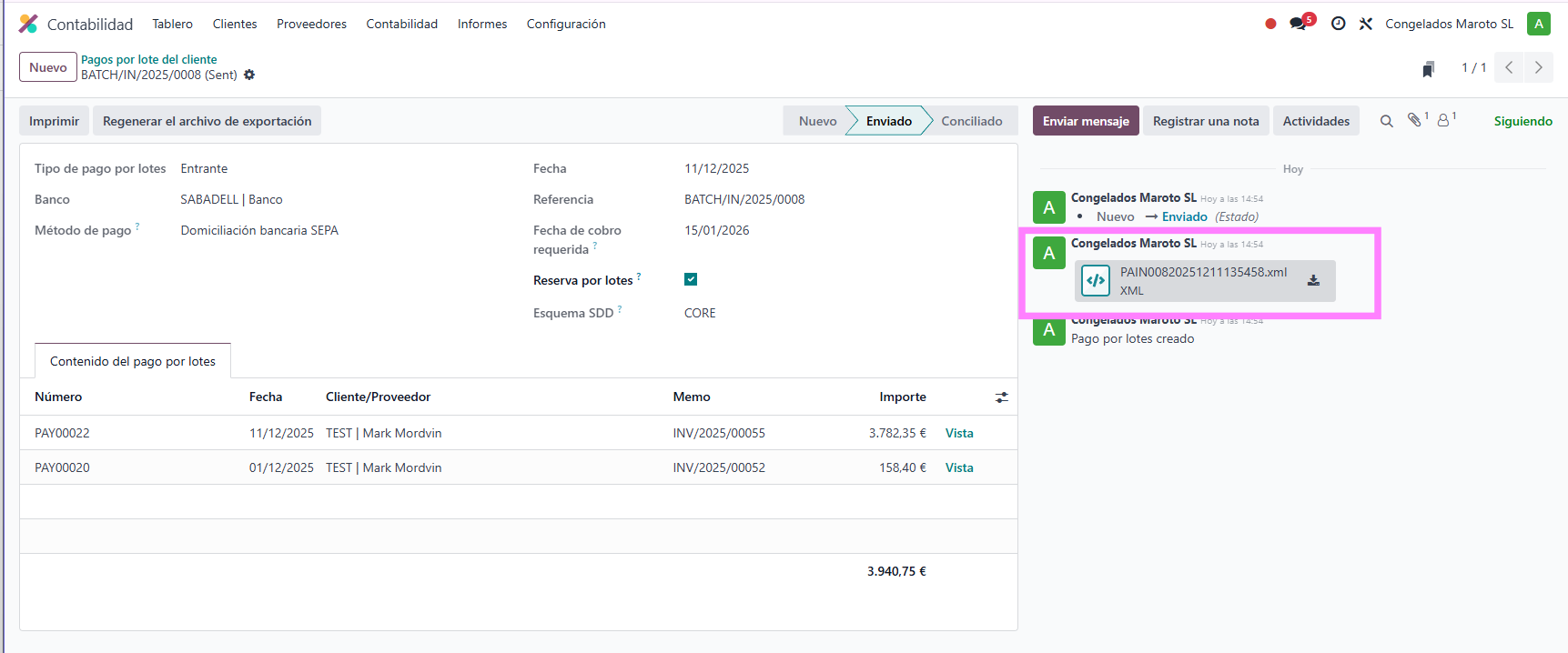 Odoo generará el fichero automáticamente. Verás un botón inteligente arriba o un enlace de descarga con nombre tipo SEPA_BNK1_...xml.